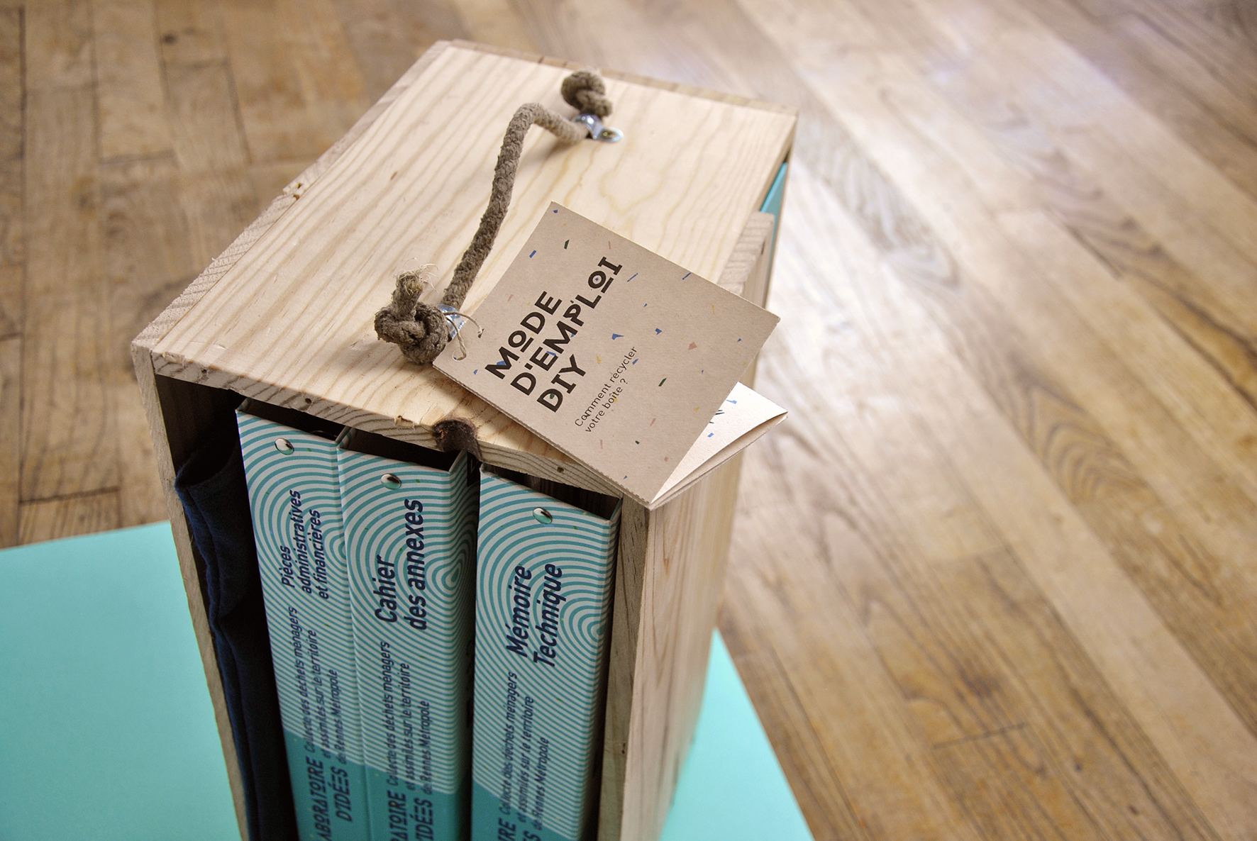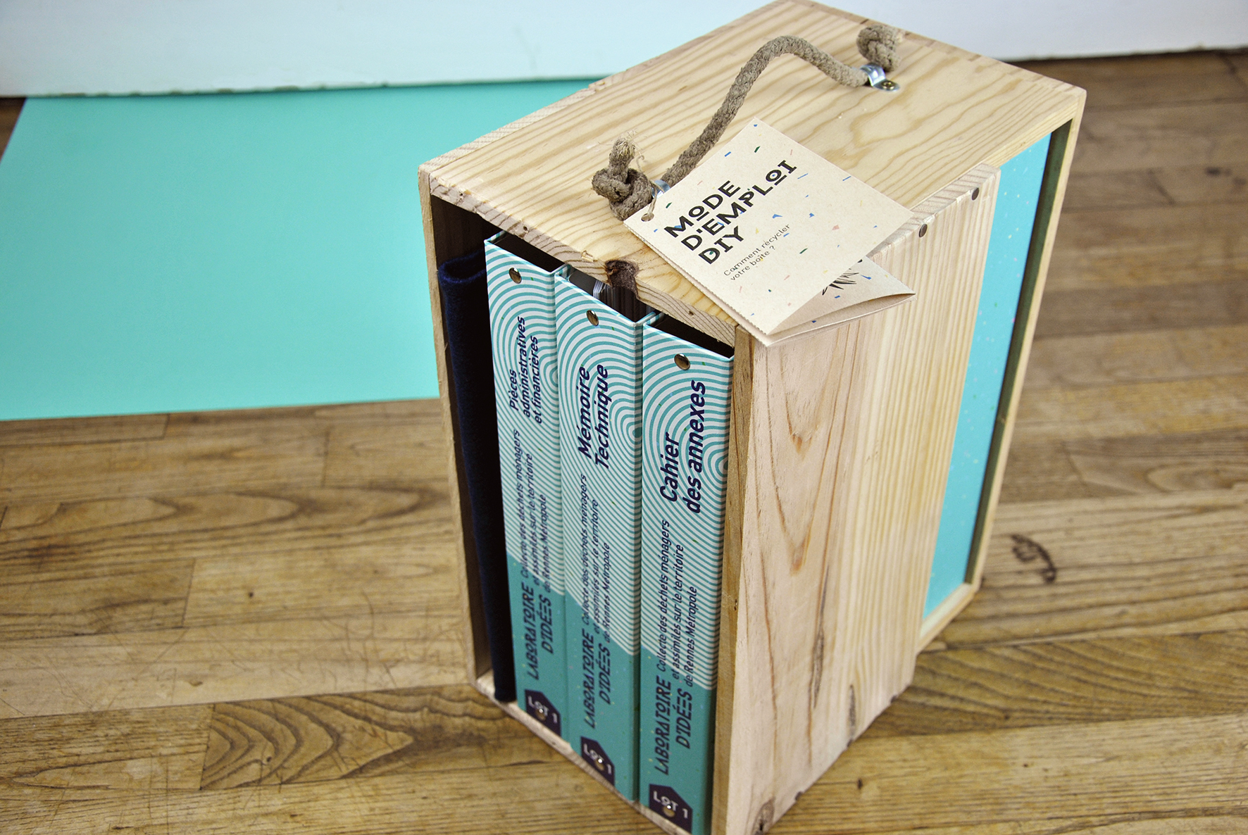 Il ne reste plus qu’à faire tenir les classeurs dedans… quelques frayeurs de dernière minute sur quelques millimètres en plus ou en moins selon la quantité de feuillets, et c’est gagné. Nous déplaçons le côté des boites pour voir les tranches des classeurs et masquer la marque du vin, nous ajoutons une poignée en corde recyclée, un peu de ponçage, et c’est prêt. Merci à Mathieu et à Gwilherm, qui nous ont bien aidé dans la fabrication :)