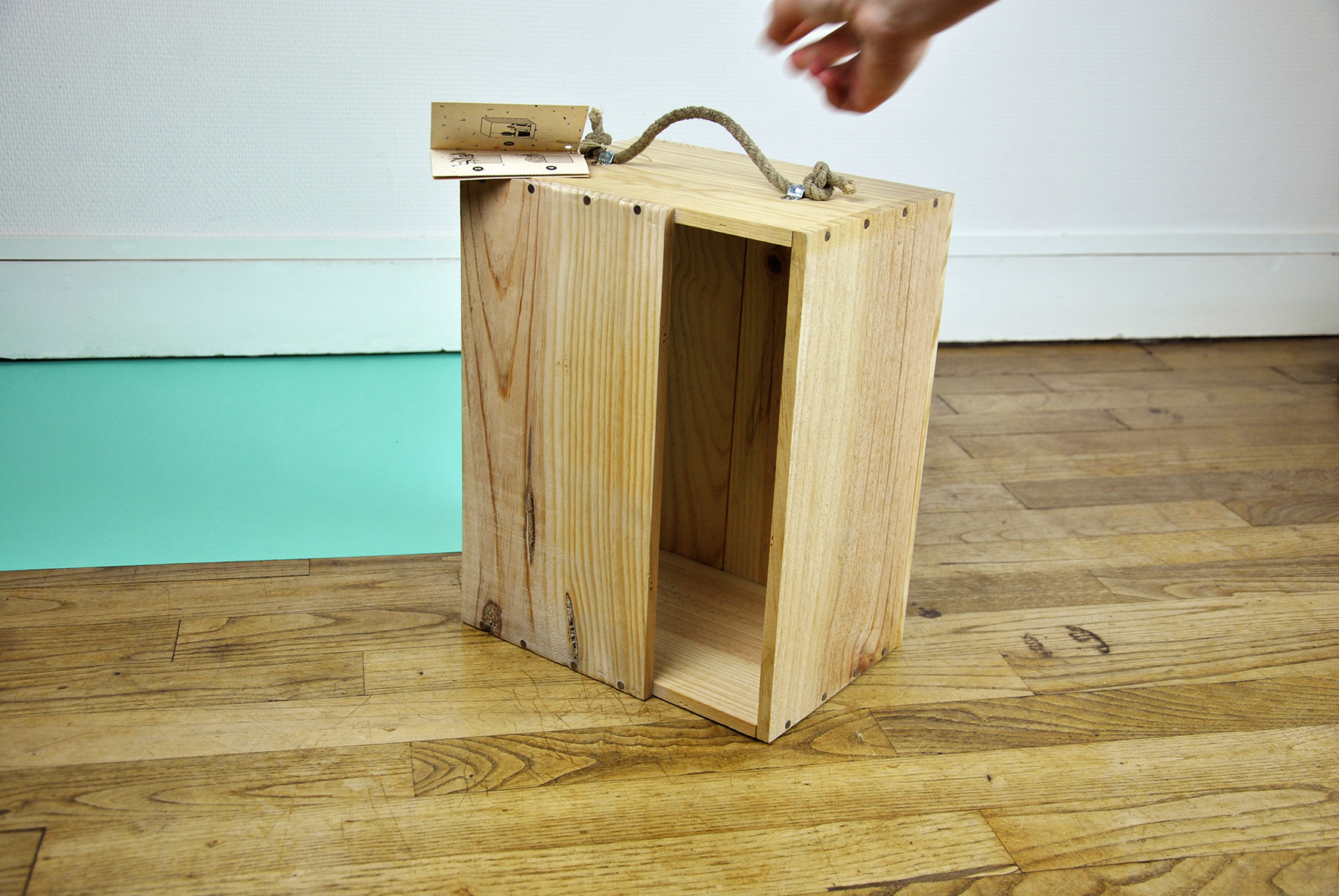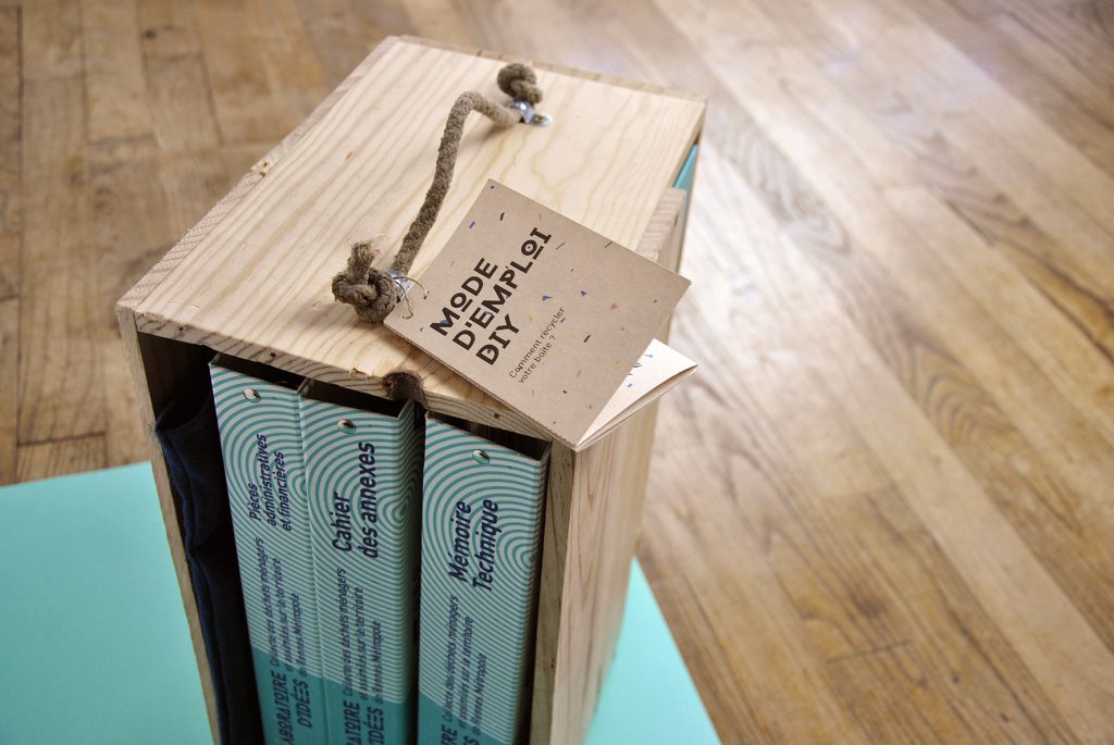 Nous proposons de recycler des caisses de bouteilles de vin. Fabriquées en pin, elles sont à la fois légères et solides (pour transporter des bouteilles lourdes et fragiles), de dimensions standard, proche des classeurs, et surtout, elles peuvent encore être utilisées après l’appel d’offre de multiples manières. On peut en faire des étagères, des paniers à chat/petit chien, des caisses de rangement de jouets, de livres, des cache-pots… D’ailleurs, nous ajoutons un mode d’emploi DIY pour inciter au recyclage des boites.