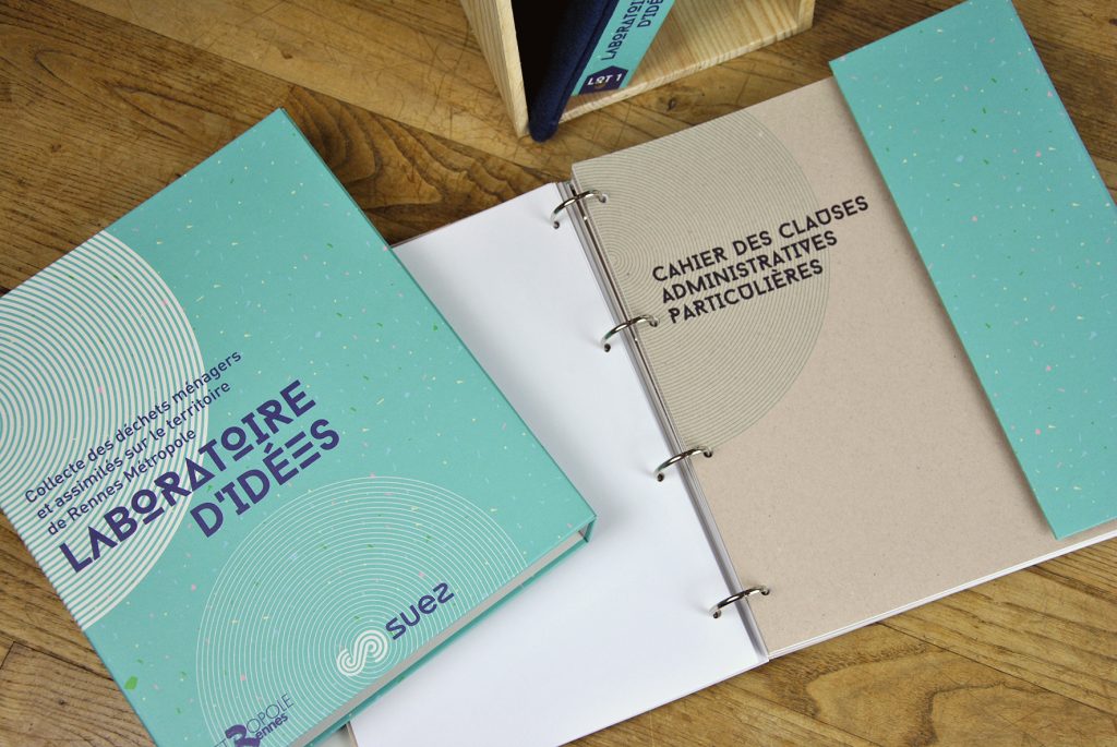 Il s’agit de proposer une identité visuelle et une mise en page qui mette en valeur l’offre de Suez. Le graphisme doit aider les équipes de Rennes Métropole à comprendre la structuration des différentes parties de la réponse, et à percevoir le positionnement et le message que souhaite délivrer l’entreprise candidate. Il faut rendre visible dès la couverture le titre de chaque document, le numéro du lot, le nom de l’entreprise, et le concept-titre de la réponse.
