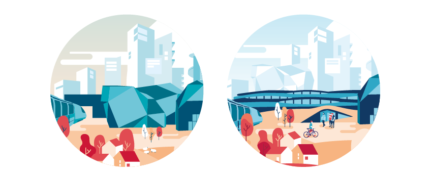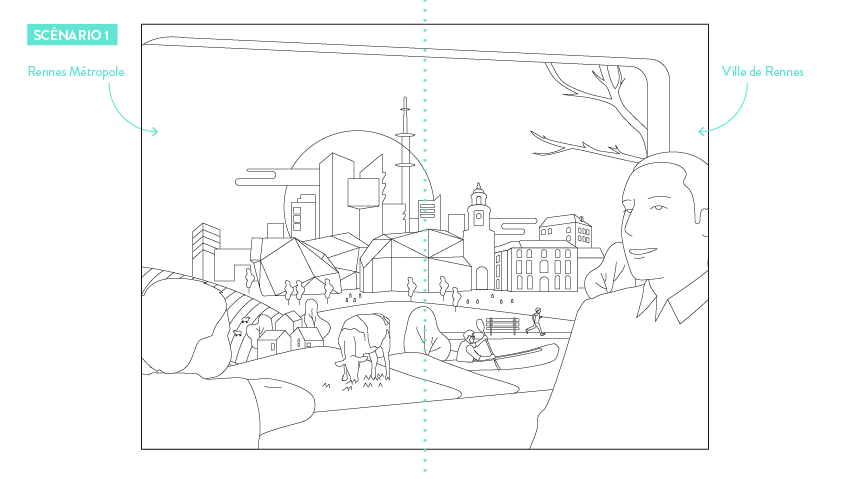 La demande est de créer un visuel commun pour les 2 collectivités (Rennes Métropole et ville de Rennes) : un paysage urbain en deux parties adjacentes gauche/droite. Les deux visuels doivent pouvoir fonctionner séparément ou ensemble. Le côté gauche, pour Rennes Métropole, doit signifier l’environnement de la nouvelle gare et l’arrivée de la LGV (Ligne à Grande Vitesse). Le côté droit, pour la ville de Rennes, est l’occasion de communiquer sur la ville à l’horizon 2020 : l’aménagement des berges, la ville à taille humaine, l’affirmation du centre ville.