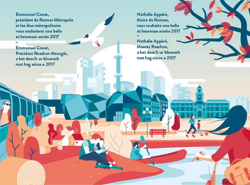 Depuis 2012, nous travaillons ponctuellement pour Rennes Métropole sur différents sujets (Dimanche au Thabor, Parcours Musée, etc.). En novembre dernier, la Responsable du Service Graphique de l’institution nous proposait de concevoir les cartes de vœux de Rennes Métropole et de la ville de Rennes. Nous avions déjà réalisé les vœux de Rennes Métropole en 2013, et apprécié cette expérience.
