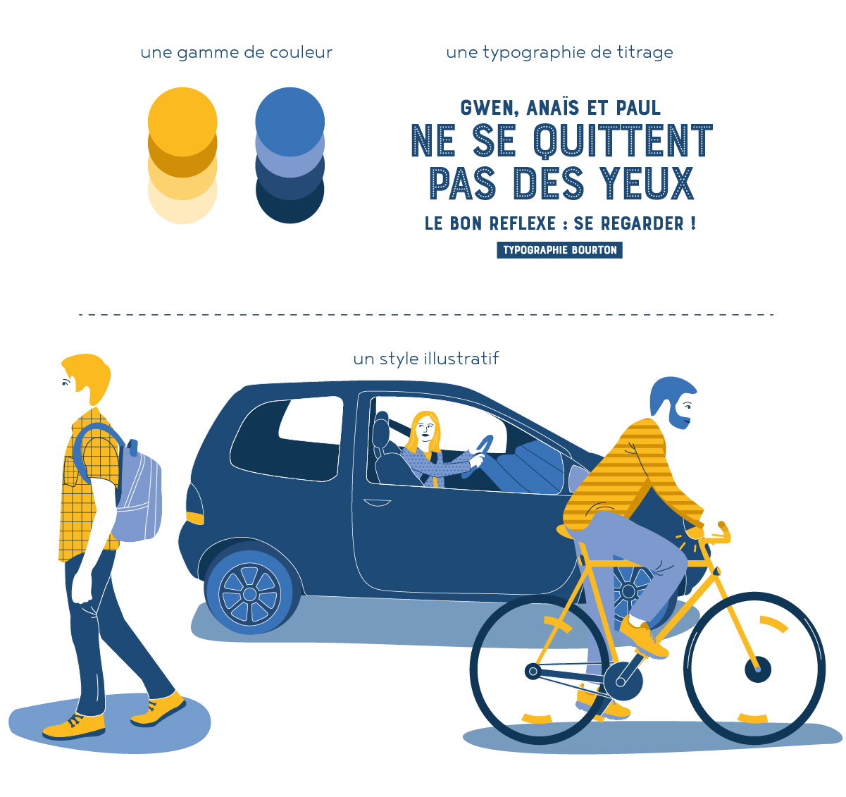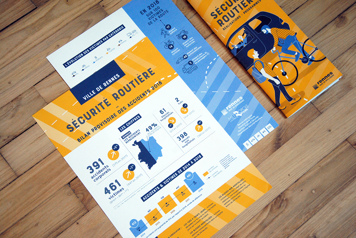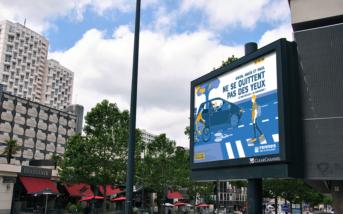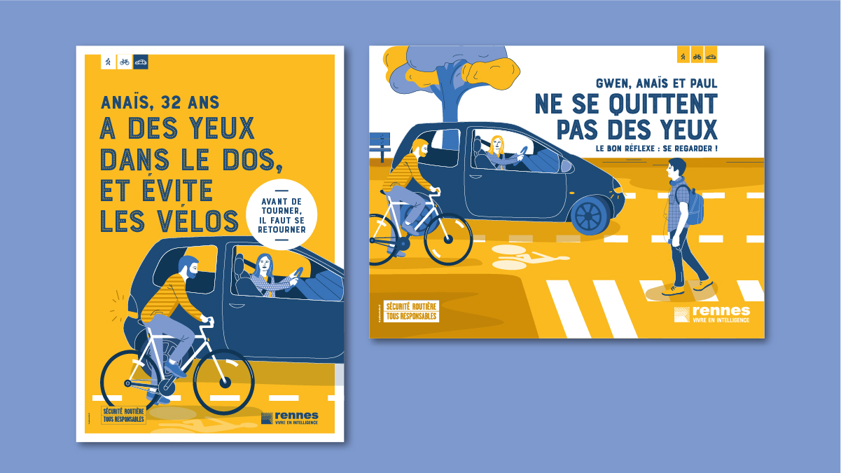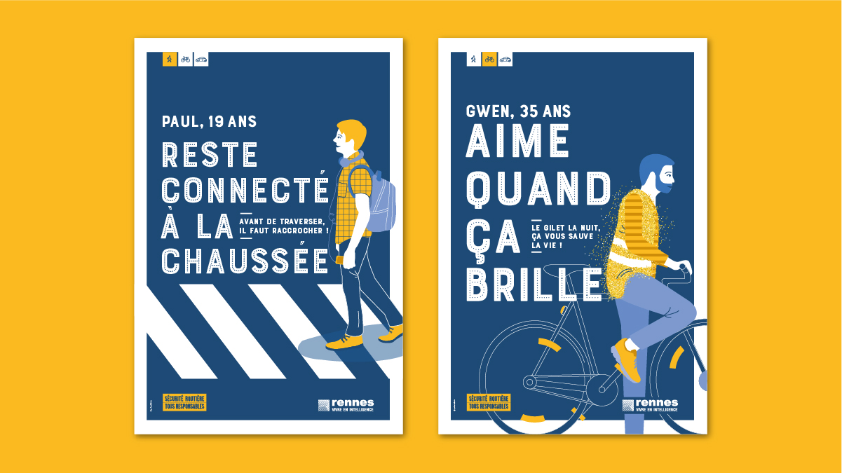 En 2019, la campagne continue avec de nouvelles situations, toujours dans le même esprit graphique. Le bleu & jaune sont inversés, le jaune de la signature de la Sécurité Routière devenant la couleur dominante. Pollen Studio rédige également la charte graphique pour permettre à la Ville de Rennes de décliner l’identité visuelle.