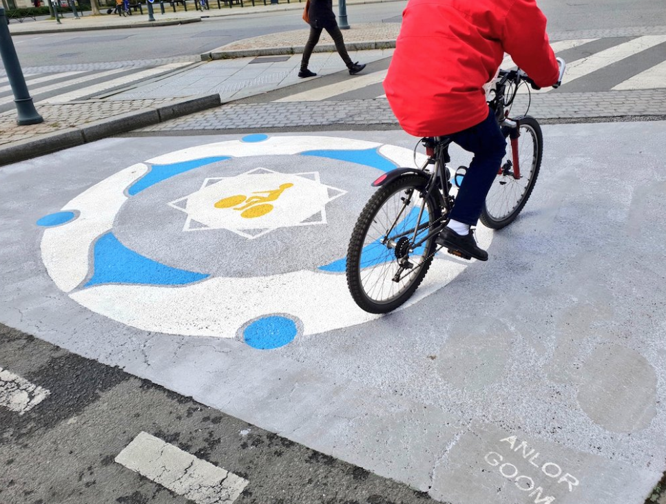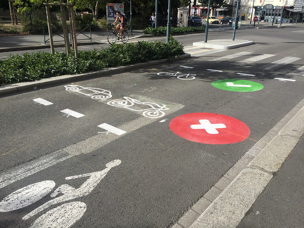 Le budget participatif permet d’étendre l’opération en habillant 9 carrefours avec de grands pictogrammes rouges et verts, pour signifier le plus clairement possible aux usagers de la chaussée qu’il faut respecter ces espaces de sécurité pour les cyclistes. Un panneau pédagogique déclinant la charte graphique est placé à proximité des sas concernés.