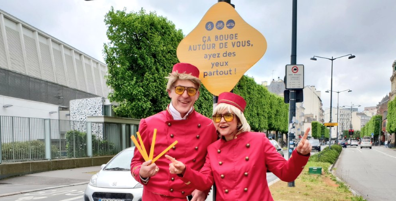 Nous imaginons également l’animation d’un carrefour rennais très fréquenté par des acteurs professionnels. Les acteurs improvisent sur les comportements des cyclistes, piétons et automobilistes et mettent en valeur la bienveillance avec humour.