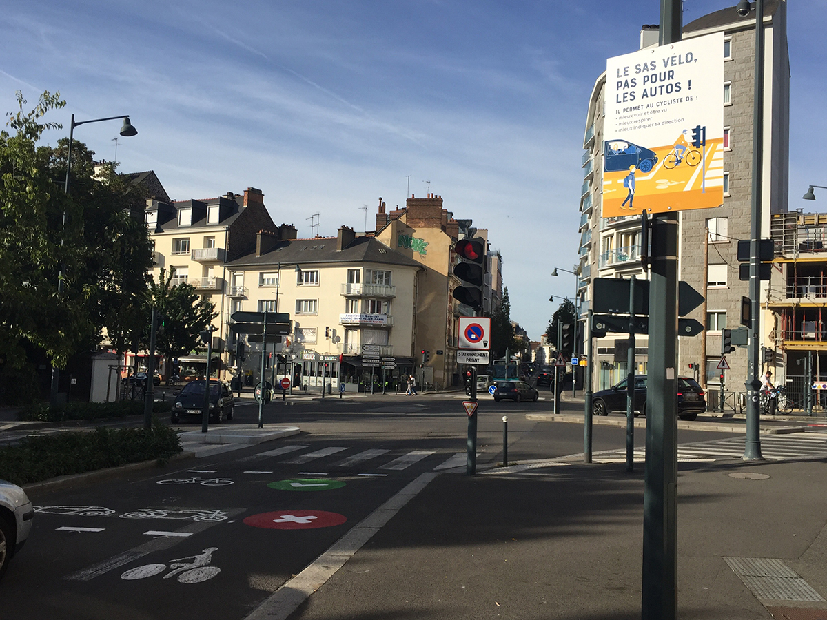 Ces espaces réservés aux cyclistes et aménagés sur des carrefours en amont des feux tricolore existent depuis 1998 dans le code de la route (+ d’infos). Ils permettent aux cyclistes de ne pas rester sur le coté droit des autres véhicules en risquant de ne pas être vus. Cela peut sembler anodin, mais c’est un risque avéré qui peut avoir de très graves conséquences (accident mortel à Paris en 2015).