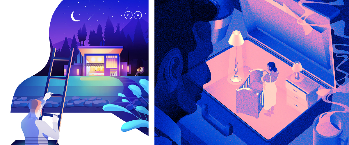 Cette année, on ajoute également des contours aux illustrations, des dessins au traits qui viennent accentuer l’attitude des personnages et leur donner vie. On chasse cette ambiance glaciale et figée du flat design !