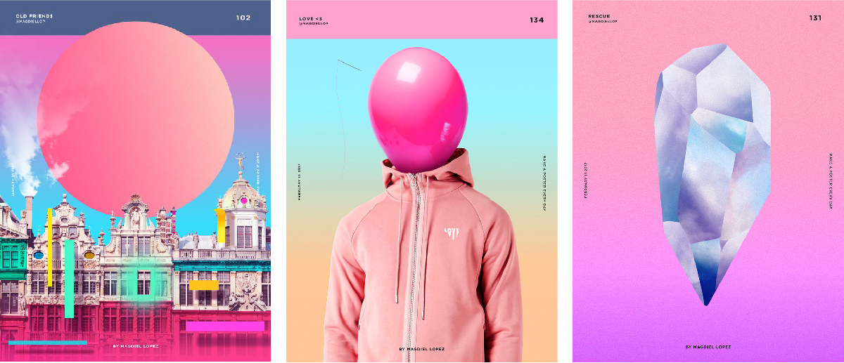 Les dégradés reviennent en force, associés aux couleurs vives. On passe sans hésitation du vert pomme au jaune citron, du saumon au violet, du bleu roi au vert jade. Le fond en dégradé permet d’habiller une image, il suffit presque à composer une affiche, et met en valeur les illustrations.