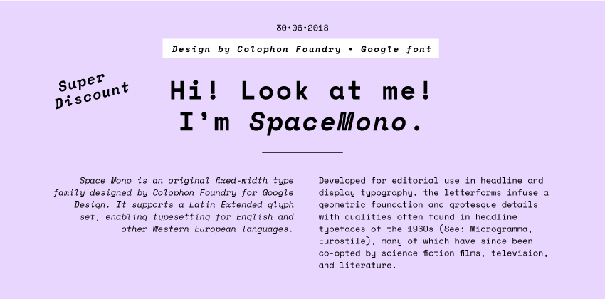 Petit rappel de ce qu’est un caractère monospace : par définition, le caractère monospace est un caractère à chasse fixe. Et la chasse, c’est quoi ? La chasse est la largeur de la lettre augmentée de ses approches. Très appréciés pour la programmation, les typos monospaces peuvent être également un véritable atout graphique dans les mises en page ou les identités.